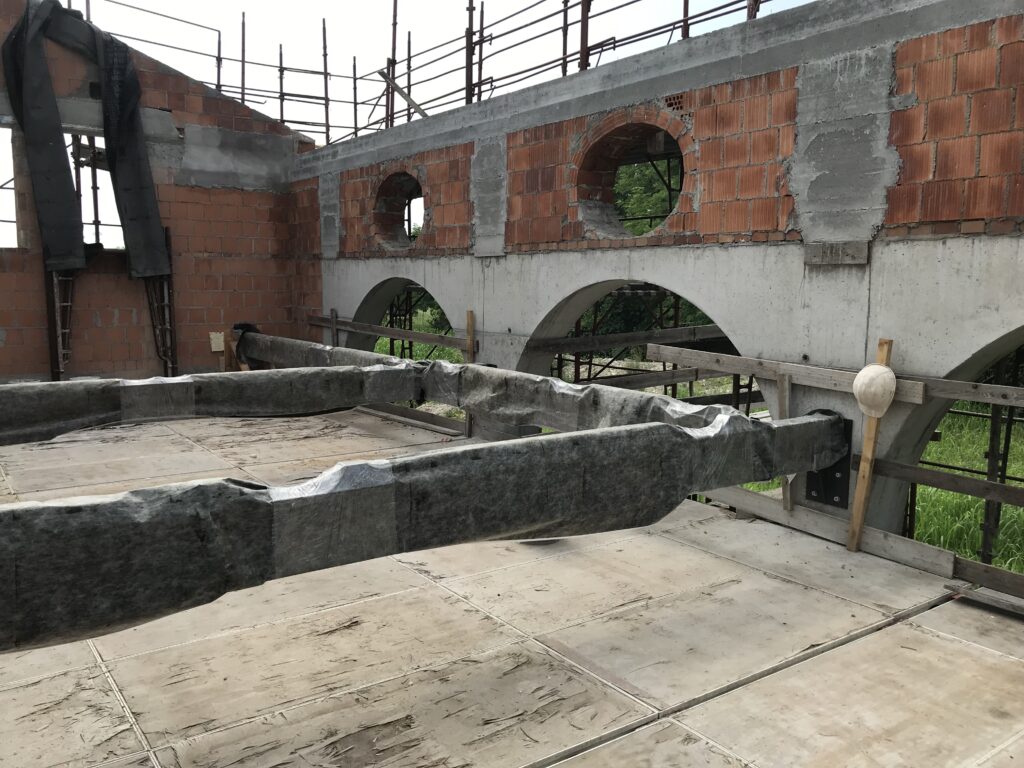 La volontà di rispettare il carattere rurale del fabbricato, ci ha spinto a mantenere le travi in legno a vista riutilizzando quelle esistenti, che sono verniciate e riposizionate in abbinamento alla nuova struttura in carpenteria della copertura e del soppalco.